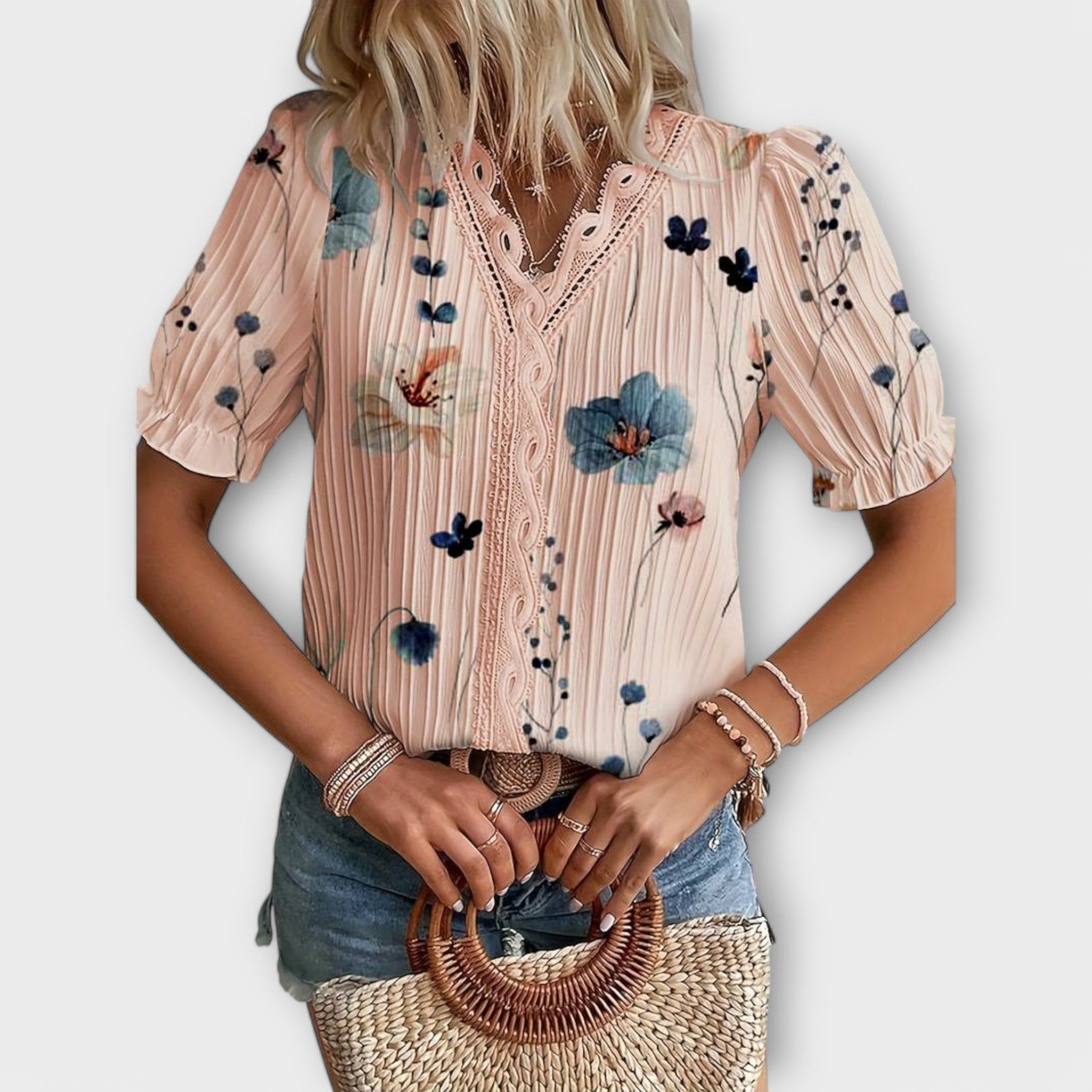 Romantika v Detajlih: Odkrijte našo cvetlično bluzo, ki izžareva ženskost in šarm. Idealna za ljubiteljice romantičnega videza brez kompromisov glede udobja.