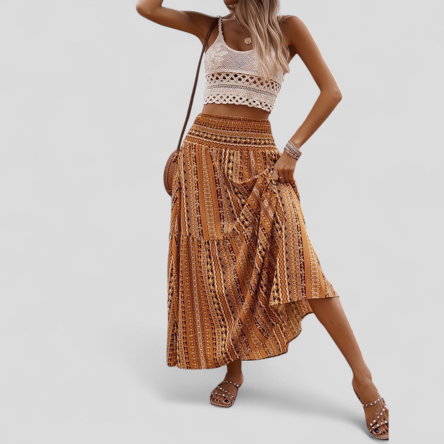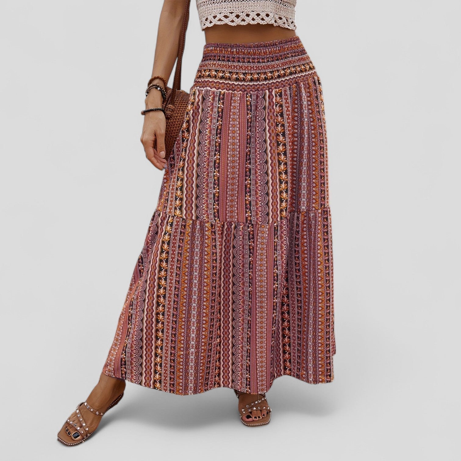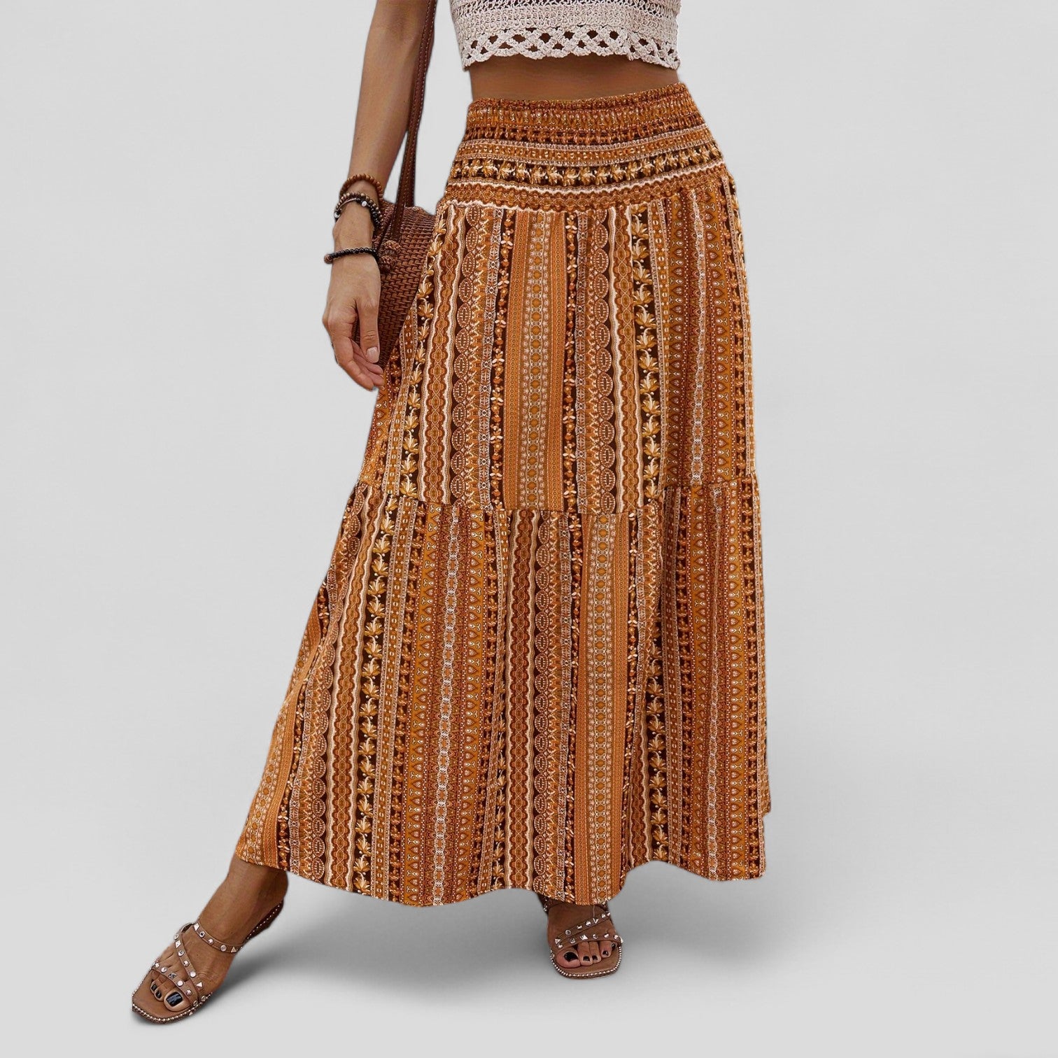 Eleganten maxi krilo z nabranim pasom okoli srednjega dela združuje tradicionalen vzorec z modernim izgledom in odlično dopolnjuje različne modne kombinacije.