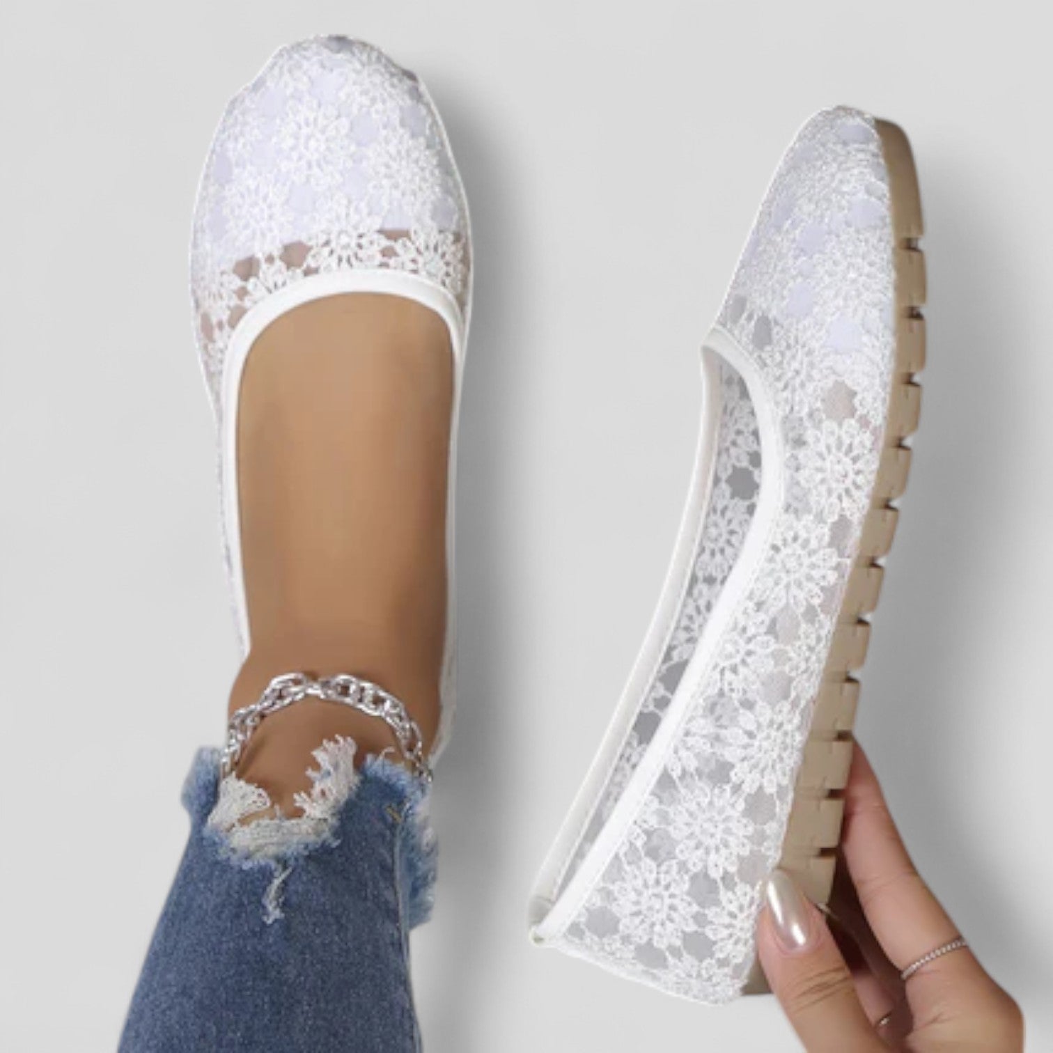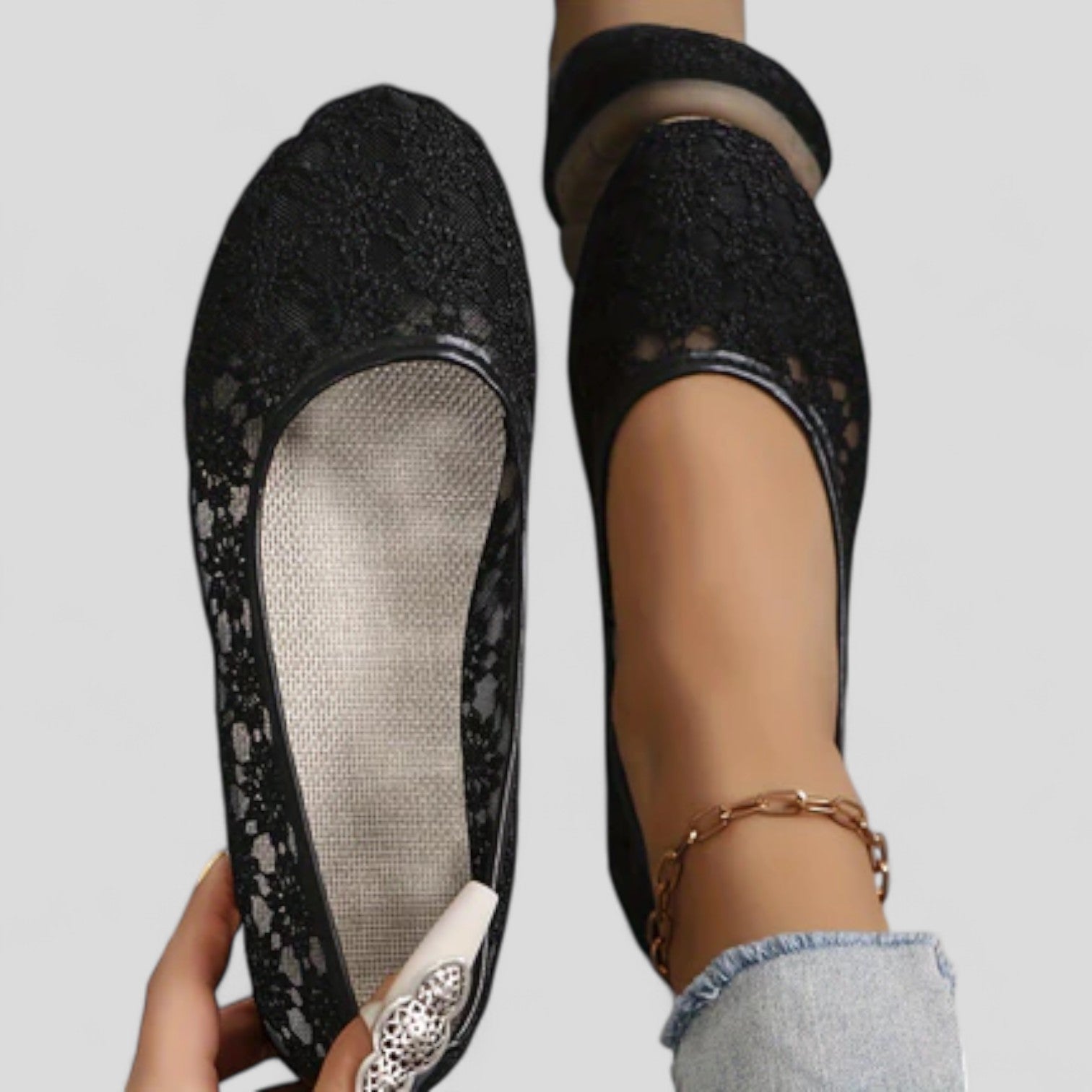 Eleganten par ballerink z nežno čipko dodaja romantičen dotik vsakemu videzu in se brez napora poda k oblekam, krilom ali jeansu.