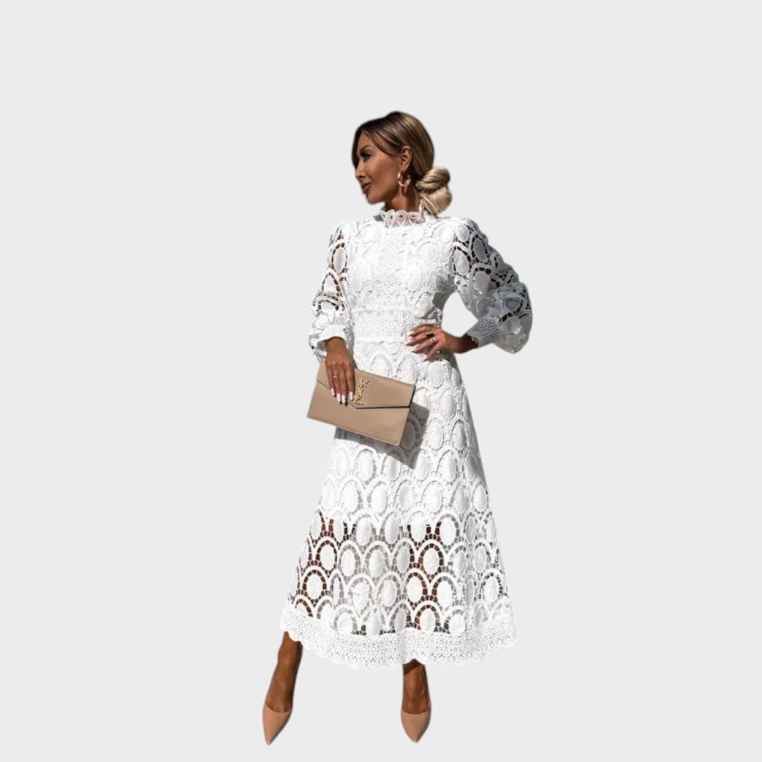 Danica - Čipkasta obleka s pufastimi rokavi in visokim ovratnikom
