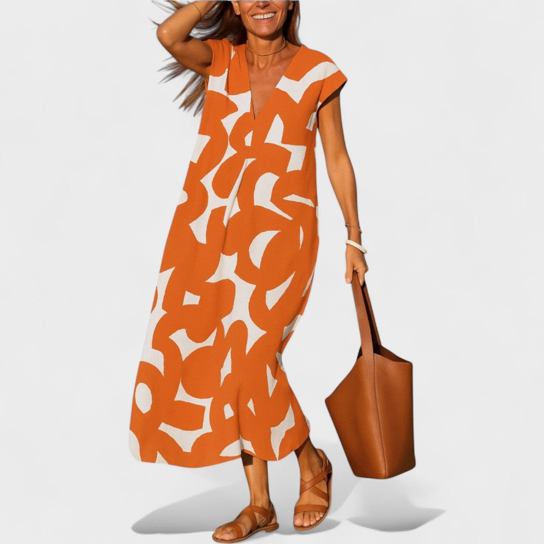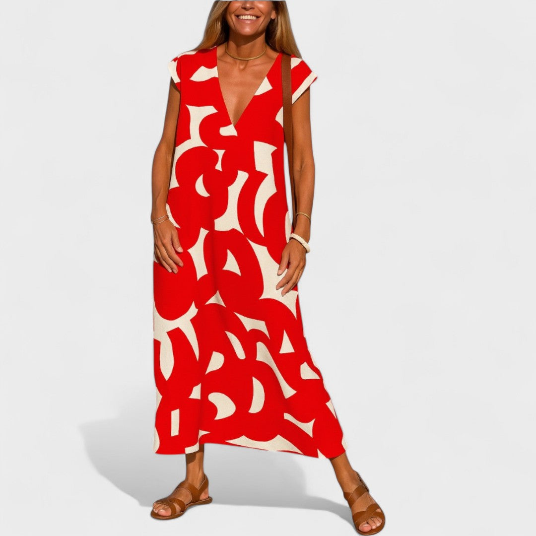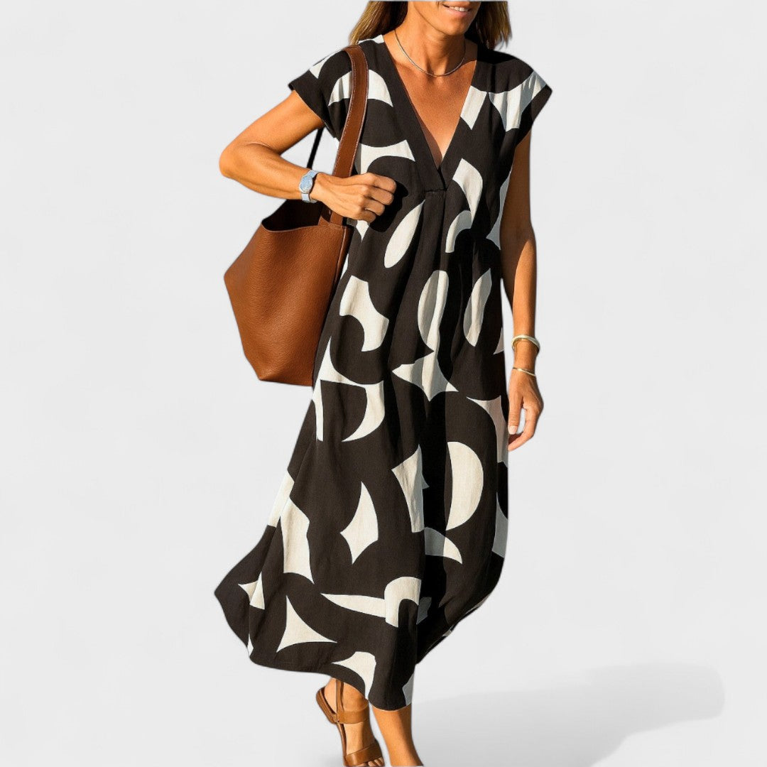 Odkrijte popolno ravnotežje med umetniško eleganco in sproščenim udobjem s to dolgo obleko, okrašeno z edinstvenim abstraktnim vzorcem. Idealna za vroče poletne dni, ponuja zračno prileganje in poseben stil v vsaki kombinaciji.